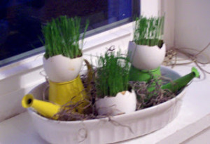 Grass is coming up in the egg shells. Don’t they look adorable? I cannot bear to part with the little display, even if Easter is passed.