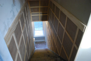 Stairway inspiration: Square board and batten to hide damaged walls