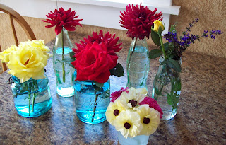 I love this! I need to get some more flowers growing in my garden so that I can just trim some off and bring them in to enjoy! Love the random bottle look though!!! Very cute!!!