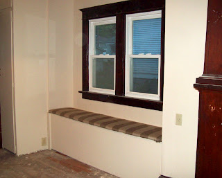 A few weeks ago, Ryan built a window-seat bench in an area that had floor boards in bad shape. Instead of replacing all the original hardwood, he just covered this area. I was in my height of glory – I love window seats.