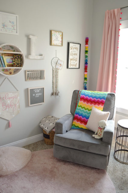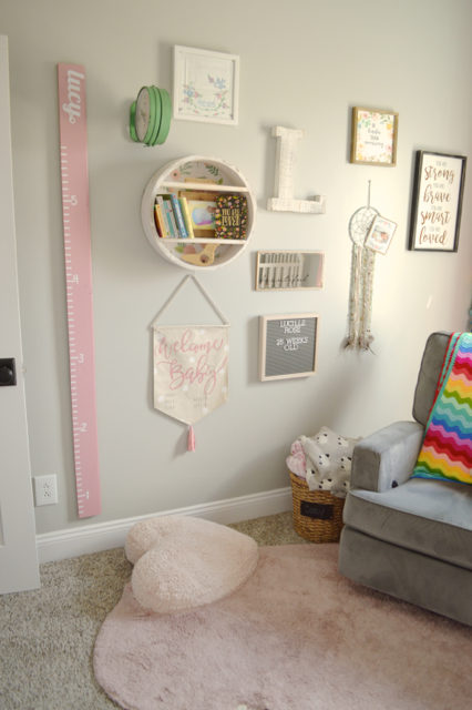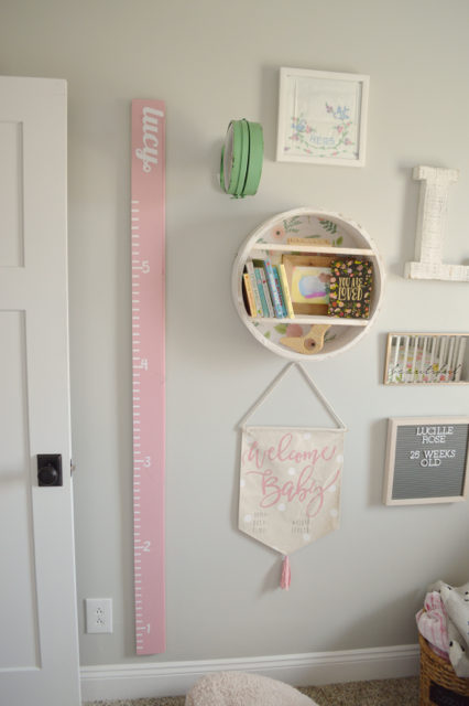 I finally added a simple pink growth chart on the wall and a few new pieces – like the “welcome baby” banner and the sign above the dreamcatcher. (Check out my tutorial for a growth chart here.) I still need to add the final numbers, but I’ll get to that before she reaches 6 feet tall.
