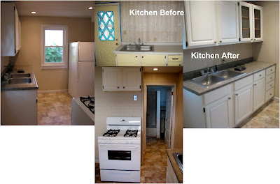 Next up in the bungalow rental property – the kitchen and bathroom. (Check out the living room/dining room and outside updates.)