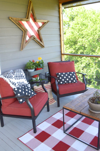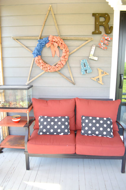 I moved the sofa to the other side of the porch this year, and it feels less cramped in here now. (Related: Patriotic wreath and RELAX decor.)