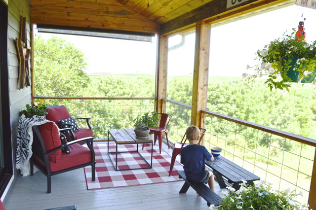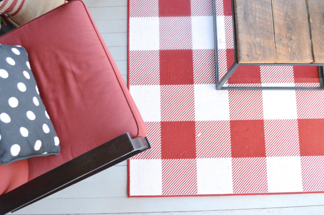 We also added this cute buffalo check rug from Target (affiliate link). I love the look of outdoor rugs, but I have had a history of issues caring for them. I find large outdoor rugs challenging to keep clean – and they have a tendency to trap moisture under them, which can be bad for wood porch floors.