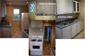 Next up in the bungalow rental property – the kitchen and bathroom. (Check out the living room/dining room and outside updates.) Here’s the kitchen. Before, it had very old base cabinets in a lovely shade of light yellow. No upper cabinets to be seen.What we did: Ripped out the base cabinets and dumped them. […]
