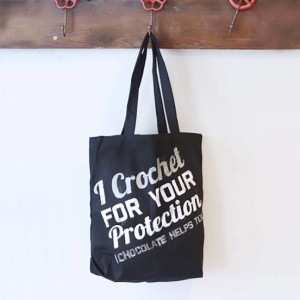 A crochet tote bag with fabric ink